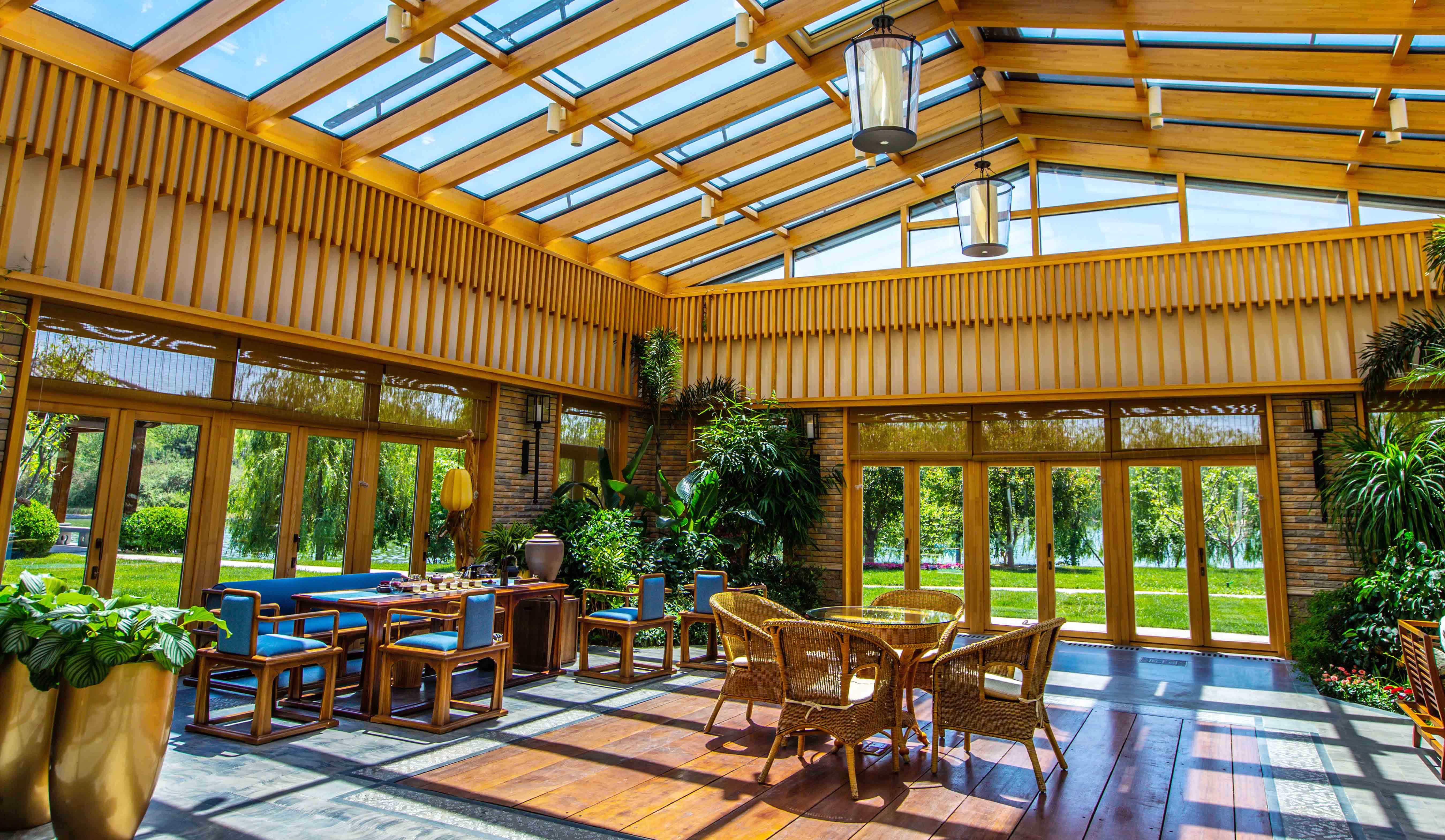 Der Wintergarten sieht wie das chinesische Zeichen für Mensch(人) aus. Um den Komfort zu erh?hen, ist das Dach mit elektronisch angetriebenen Schiebedachfenstern und Markisen ausgestattet. Hinsichtlich der Beleuchtung haben wir ein ausgereiftes Designkonzept entwickelt, das uns anleiten kann, durch Einsatz von Beleuchtungsanlagen Szenarien zu schaffen, die bestens mit dem Stil des Geb?udes und den Wohneinrichtungen harmonieren k?nnen.