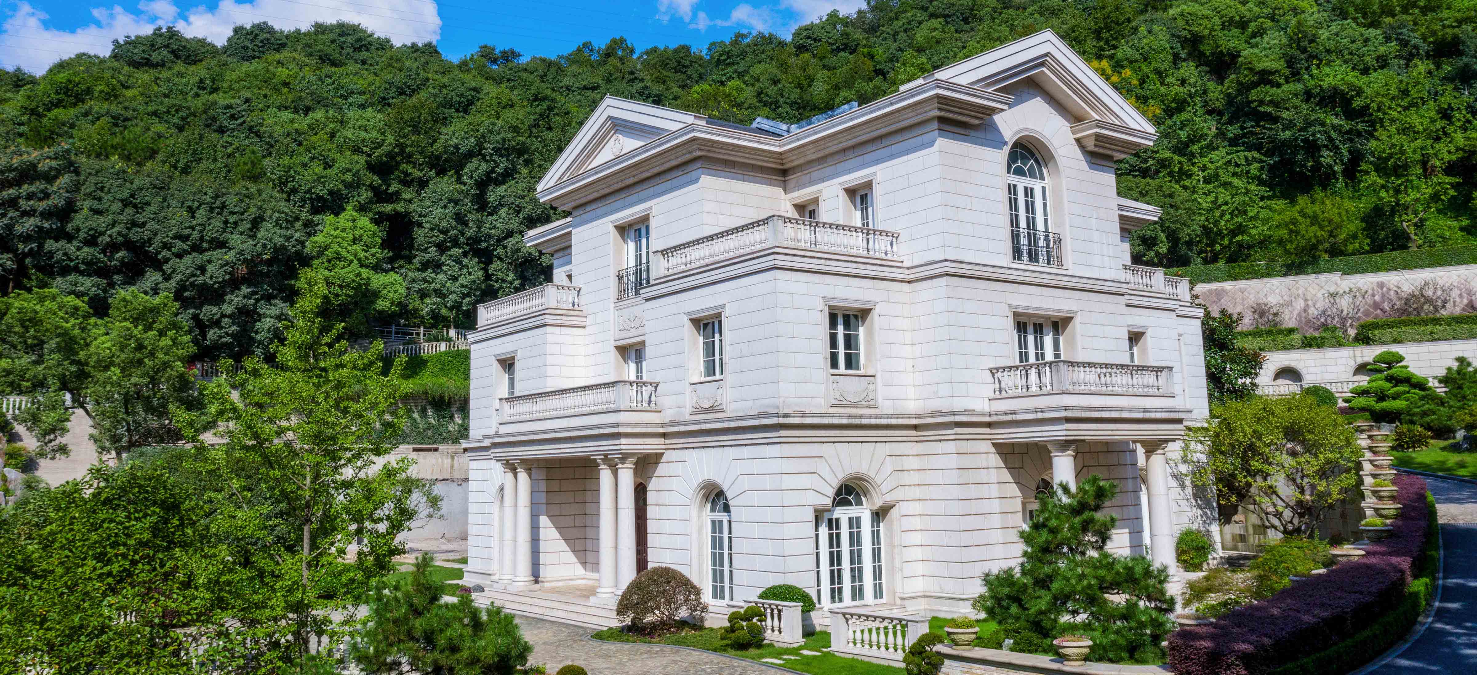 Beidiesem Projekt wirkt die Au?enmauer aus importiertem Kalkstein mit ausgezeichneter Textur und feinen Schnitzereien imposant. Für unsere Produkte sind importierte japanische Schwarzkiefer und Podocarpus mit einheimischen Baumarten gemischt verwendet, was einen erfreulichen, friedlichen und ruhigen Eindruck vermittelt. Als ein deutscher Anbieter von hochwertigen ma?gefertigten Fenstern, Türen sowie Wintergartensystemen spielt HANS-ROCK ihren technischen Vorrang voll aus und l?dt deutsche Designer zum Mitwirken an gesamter Projektgestaltung ein, um riesige Bogenfenster, T-f?rmige Winterg?rten und andere klassische Formen zu entwerfen. Diese Elemente passen mit dem Geb?ude und den G?rten perfekt zusammen und dadurch ist eine harmonische Einheit entstanden, in der sich die Landschaft mit jedem Schritt ?ndert und verschiedene Elemente sich gegenseitig erg?nzen, was den ?sthetischen Wert des Geb?udes deutlich hervorhebt.